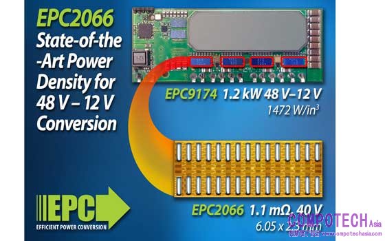 EPC2066的低損耗和小尺寸使其成為用於最新伺服器和人工智能的高功率密度、40 V~60 V/12 V DC/DC轉換器次級側的理想開關元件。它也是電源供電和銀盒數據中心伺服器中次級側同步整流至12 V的理想元件,而且適用於24 V~32V的高密度馬達控制應用。氮化鎵場效應電晶體可在高頻工作、具有高效率和13.9mm2的超小尺寸等優勢,可以實現最高功率密度。