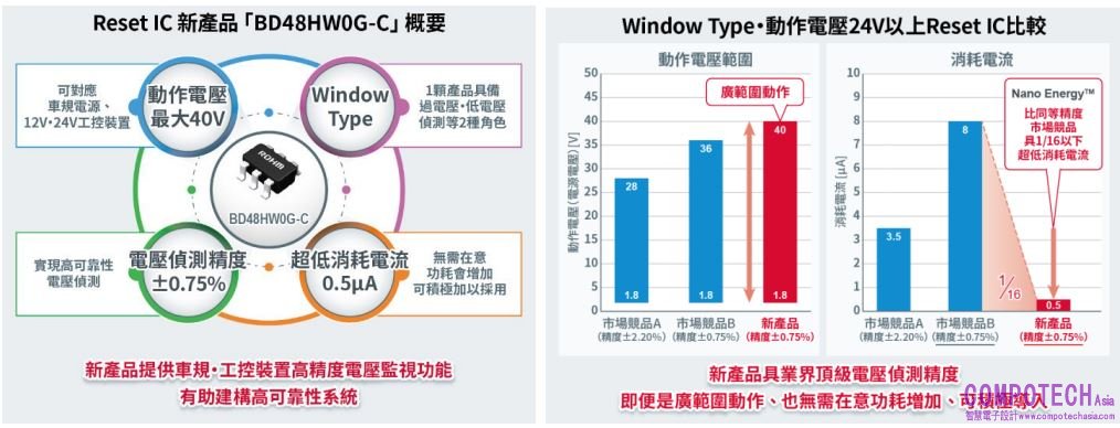 新產品透過高耐壓BiCDMOS製程,融合ROHM自豪的類比設計技術,實現高達40V的工作電壓和領先業界的±0.75%電壓檢測精度,屬於Window Type*1Reset IC。此外,還可以靈活設置檢測電壓,從標準Reset IC常見的微控制器周圍的低電壓範圍,到車電和工控設備電源的高電壓範圍,均可以高精度地監控電壓異常情況,因此有助在廣泛應用中建構毫無浪費(電壓餘裕適中)且具有高可靠性的系統。