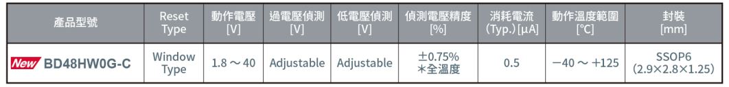 新產品「BD48HW0G-C」是一款Window Type Reset IC,實現了1.8V~40V的超寬工作電壓範圍和±0.75%(整個溫度範圍)的業界頂尖電壓檢測精度。除了工作電壓高達40V外,還可以透過外接電阻靈活地設置檢測電壓,因此可以高精度地對從低到高的超寬電壓範圍檢測電壓異常情況,非常適用於包括車電和工控設備的電源電路在內的廣泛應用,有助應用產品建構毫無浪費且具有高可靠性的系統。