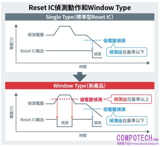 Reset IC用於電子電路的電壓監控,具有在超過閾值(即檢測電壓)時改變輸出的功能,因此具有透過與微控制器合作來確保系統安全的作用。標準的Reset IC只能監測單側(過壓或欠壓)電壓,被稱為Single Type Reset IC;而Window Type Reset IC則可以監測兩側的電壓,因此一個產品將可以發揮兩種作用。