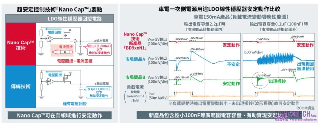 為了解決上述課題,ROHM於2020年確立了用於電源IC的超穩定控制技術「Nano Cap™」。本次LDO穩壓器新產品搭載了Nano Cap™技術,在輸出電容容量非常小的條件下也能安定動作。