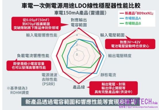 「BD9xxN1系列」是車電一次側LDO系列新產品,滿足車電產品125℃以上工作和汽車電子產品可靠性標準「AEC-Q100」的要求,也滿足一次電源輸入電壓40V以上等基本要求。利用超穩定控制技術「Nano Cap™」,新產品能夠支援不到市場競品1/10的100nF輸出電容量,即使在輸入電壓和負載電流波動時,也能實現應用產品要求的穩定性(輸出電壓波動在100mV以內:負載電流波動1mA⇔50mA/1µ秒時)。在支援輸出電容範圍和響應性能等也具優異成績,在業界中是一款各項性能都均衡表現的高性能產品。