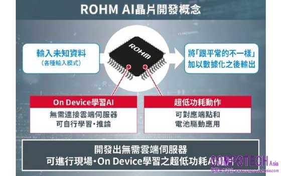 2022年10月6日--半導體製造商ROHM(總公司:日本京都市)推出一款On Device學習*AI晶片(配備On Device學習AI加速器的SoC),該產品利用AI(人工智慧)技術,能以超低功耗即時預測內建馬達和感測器等電子裝置故障(故障跡象檢測),非常適用於IoT領域的邊緣運算裝置和端點*1。
