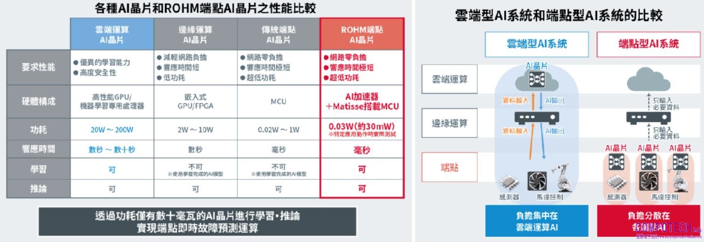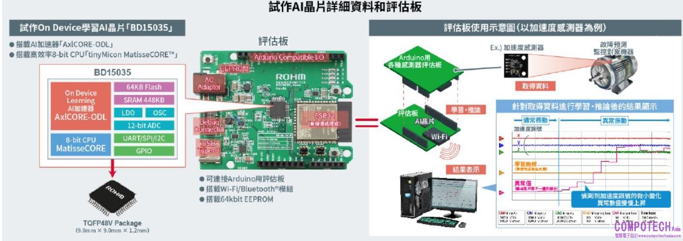 本次研發出的裝置端學習AI晶片原型(產品型號:BD15035)在人工智慧技術的基礎上,採用了慶應義塾大學松谷教授研發的「On Device學習演算法(三層神經網路*4的AI電路)」。為了推出符合市場需求的產品,ROHM將該AI電路的大小從500萬Gate縮小為2萬Gate,僅為原來的0.4%,並將其重新構建為自有的AI加速器「AxlCORE-ODL」,同時利用ROHM的8位元高效微處理器「tinyMicon MatisseCORE™」進行AI加速器的運算控制,實現僅數十毫瓦的超低功耗AI學習和推理。利用本產品,無需連接雲端伺服器或事先進行AI學習,就可以在裝置現場將未知的輸入資料和模式(例如加速度、電流、照度、聲音等)轉成「與平常的相異(出現異常)」的數值並加以輸出,因此不僅可以降低雲端伺服器和通訊成本,還能透過現場AI進行即時故障預測(故障跡象檢測)。