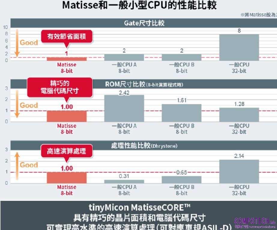 tinyMicon MatisseCORE™(Matisse: Micro arithmetic unit for tiny size sequencer)是ROHM自主研發的8位元微處理器(CPU),該產品可隨著物聯網技術的發展來提高類比IC的智慧化程度。憑藉針對嵌入式應用而進行最佳化的指令集和最新的編譯器技術,以高標準實現了更小的晶片面積和程式碼、以及更高速的運算處理能力。此外,該產品還符合汽車功能安全標準「ISO 26262」、ASIL-D等,適用於對可靠性要求高的應用。另外,利用內建的自有「即時除錯」功能,在除錯時的處理可以完全不影響應用程式的運行,因此能在應用產品工作的同時進行除錯。