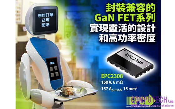 宜普電源轉換公司 (EPC) 推出150 V、6 mΩ EPC2308 GaN FET,讓高功率密度應用實現更高的性能和更小的解決方案,包括 DC/DC轉換、AC/DC SMPS和充電器、太陽能優化器和微型逆變器,以及馬達控制器。