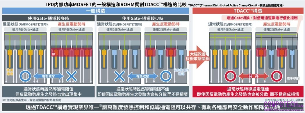 ROHM獨家電路和元件技術。IPD內部的功率MOSFET部分在關斷時會因反電動勢而發熱,透過優化控制流過電流的通道數量,實現了在保持小型封裝的前提下很難同時兼顧的低發熱量和低導通電阻。