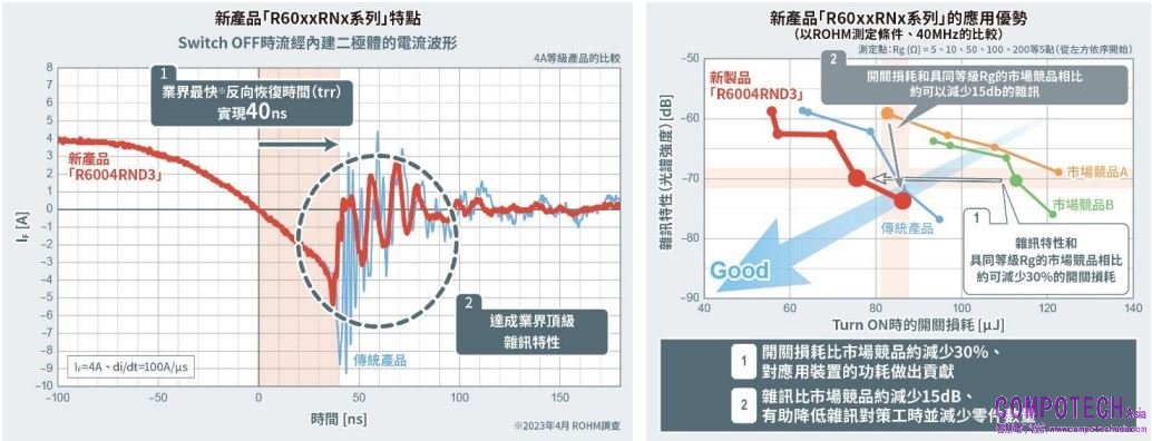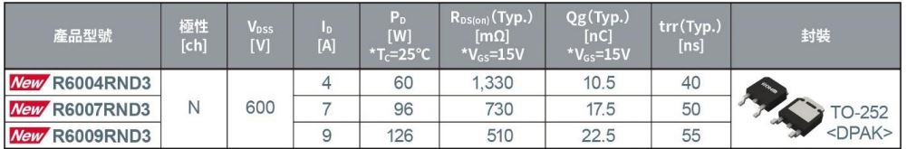 在上述背景下,ROHM於2012年實現了具有業界最快反向恢復特性的Super Junction MOSFET PrestoMOS™的量產,該系列產品由於可大幅降低應用設備功耗因而廣受市場好評。在此基礎上,這一次ROHM又推出「R60xxRNx系列」3款新產品,透過優化結構實現了出色的低雜訊特性和業界最快反向恢復時間。
