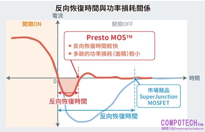 PrestoMOS™是ROHM獨家的功率MOSFET品牌,該品牌的MOSFET產品不僅保持了Super Junction MOSFET高耐壓和低導通電阻的特點,還縮短了內建二極體的反向恢復時間。因其可有效降低開關損耗而越來越常被運用於空調和冰箱等配備逆變電路的應用。