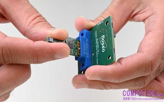 3 - FSE-122 氣體速度和溫度感測模組的其中一種變體提供兩個元件:一個測量 35mm x 13mm 的擴展 PCB模組,可以插入適配器板中(如上圖所示)。
