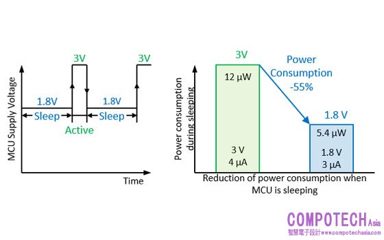 XCL233系列是搭載了VSET輸出電壓切換功能,採用了超低消耗電流電路以及PFM控制方式的線圈一體型降壓同步整流DC/DC轉換器。 VSET輸出電壓切換功能是通過信號輸入來切換兩個輸出電壓的功能。當此功能安裝在具有寬工作電壓範圍的低功耗MCU上時,在待機期間提供低電壓,在傳感器通信等活動期間提供高電壓,可以高效驅動設備,有助於大幅延長小型設備的電池壽命。 (圖1)