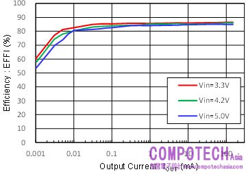 超低消耗電流電路將電流消耗降低至200nA,同時採用PFM控制方式使得產品在輕負載下顯著提高效率(圖2)。特別是MCU和SoC的功耗越來越低,其在休眠期間輸出電流範圍(數μA~10μA)的效率對於電池壽命很重要,在此電流範圍內傳統DC/DC轉換器的效率低於20%,而XCL233的效率大幅提高到了80%以上。此外,XCL233可選擇0.5V的低輸出電壓,適用於低電壓化的SoC。