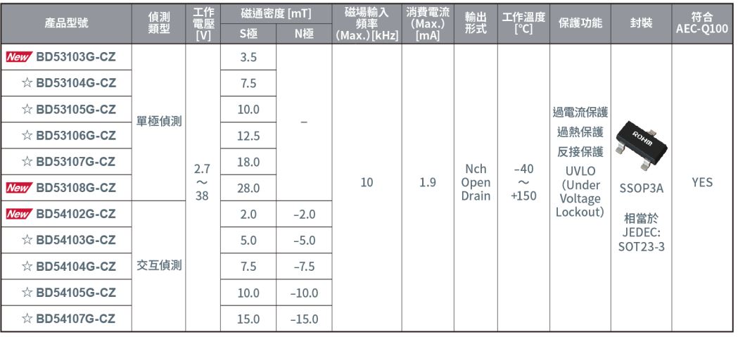 在新產品中,單極偵測型「BD53103G-CZ / BD53108G-CZ」和交互偵測型「BD54102G-CZ」已於2023年6 月起暫以每月150萬個的生產規模投入量產(樣品價格300日元/個,未稅)。另外新產品也已開始透過電商平台銷售。