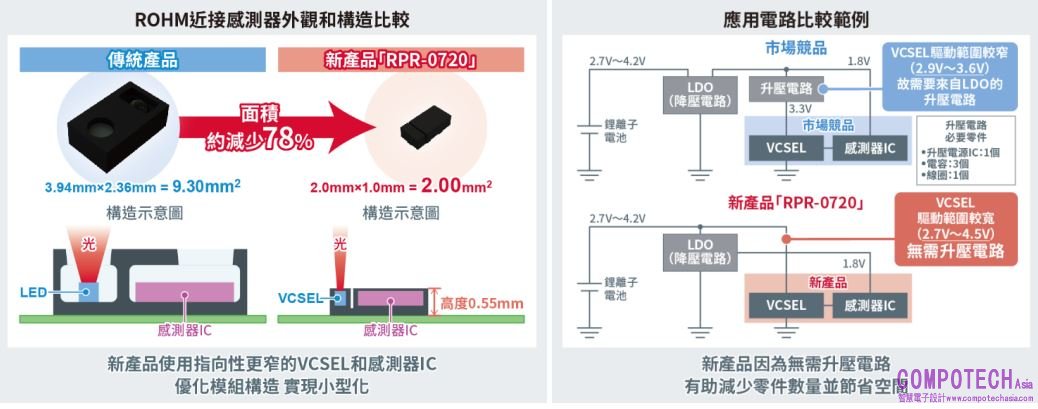新產品是一款以指向性比LED更窄的VCSEL*為發光元件、使用感測器IC為受光元件的光學感測器模組。透過ROHM自產元件優化模組結構,實現了小尺寸,與傳統產品相比,產品安裝面積減少了約78%。另外,其所配備的VCSEL支援2.7V~4.5V的輸入電壓範圍,在使用鋰離子電池時無需周邊的升壓電路(例如:1個升壓電源IC、3個電容、1個線圈等),有助應用產品小型化並確保增加電池容量的空間。上述特點使新產品不僅適用於無線耳機和智慧型手錶等穿戴式裝置的脫戴偵測應用,還適用於各類型應用的狀態偵測應用。