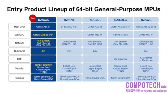 RZ/G3S是瑞薩RZ/G系列MPU的最新成員,可滿足現代物聯網設備的嚴格要求,在待機模式下最低10μW(微瓦)的功耗,以及Linux作業系統的快速啟動。新的MPU具備PCI Express介面,可提供與5G無線模組之間的高速通訊。此外,該元件還擁有進階的安全功能,例如篡改檢測,以確保資料安全。經由這些功能使其成為家庭閘道、智慧電錶和追蹤裝置等物聯網應用的理想選擇。
