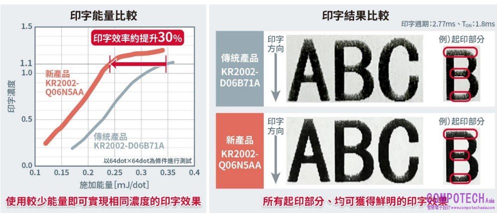半導體製造商ROHM(總公司:日本京都市)推出一款可實現高性能列印並可節能約30%、由1-cell鋰離子電池(3.6V)驅動的新結構熱感寫印字頭「KR2002-Q06N5AA」。