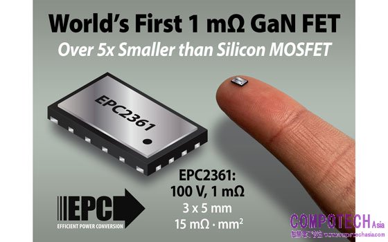EPC2361 的RDS(on) 典型值只有1 mOhm,採用耐熱的QFN封裝,頂部裸露,封裝面積只有3 mm x 5 mm。 EPC2361的RDS(on) 最大值x 面積僅為15 mΩ*mm2 – 比等效100 V 矽 MOSFET的體積小超過五倍。