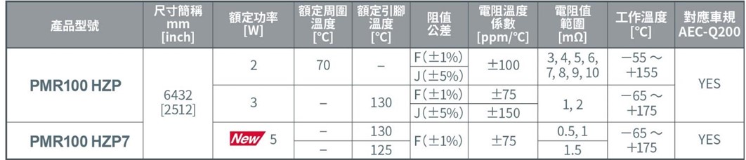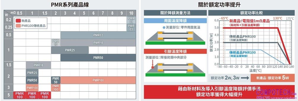 新產品透過採用溫度特性優異的新材料和引腳溫度降額*1,實現了5W的額定功率。這在有保護膜的6432尺寸平面晶片型產品中屬於業界最高等級。與PMR100系列中的傳統2W產品相比,新產品的額定功率提高了約2.5倍,與3W產品相比,額定功率提高了約1.7倍,可以替換大型大功率產品,因此有助應用產品小型化。