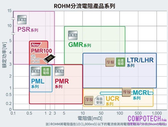 PMR系列是ROHM分流電阻系列中最標準的金屬板電阻,該系列涵蓋了電阻市場從「1005(1.0mm×0.5mm)」到「6432(6.4mm×3.2mm)」的七種標準尺寸。