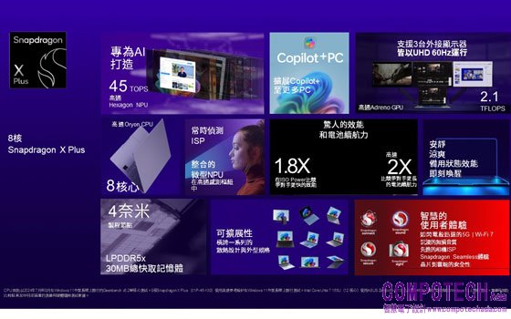Snapdragon X Plus平台由8核心的高通Oryon CPU提供支援,實現如閃電般迅速的反應速度和效率,提供61%更快的CPU效能,而競爭對手的產品在同效能的所需功耗多出179%。 此平台採用整合GPU和並支援多達三台外部顯示器,確保出色的圖像和沉浸的視覺體驗。8 核Snapdragon X Plus受惠於45 TOPS的強大NPU核心,具備先進的AI 處理能力和領先的每瓦效能,結合平台在連網方面的重大進步,將帶來具驚人的電池續航力的超便攜設計,將生產力推向新高度。無論是隨時隨地建立簡報或視訊會議,此平台的多樣化功能將實現變革的體驗。
