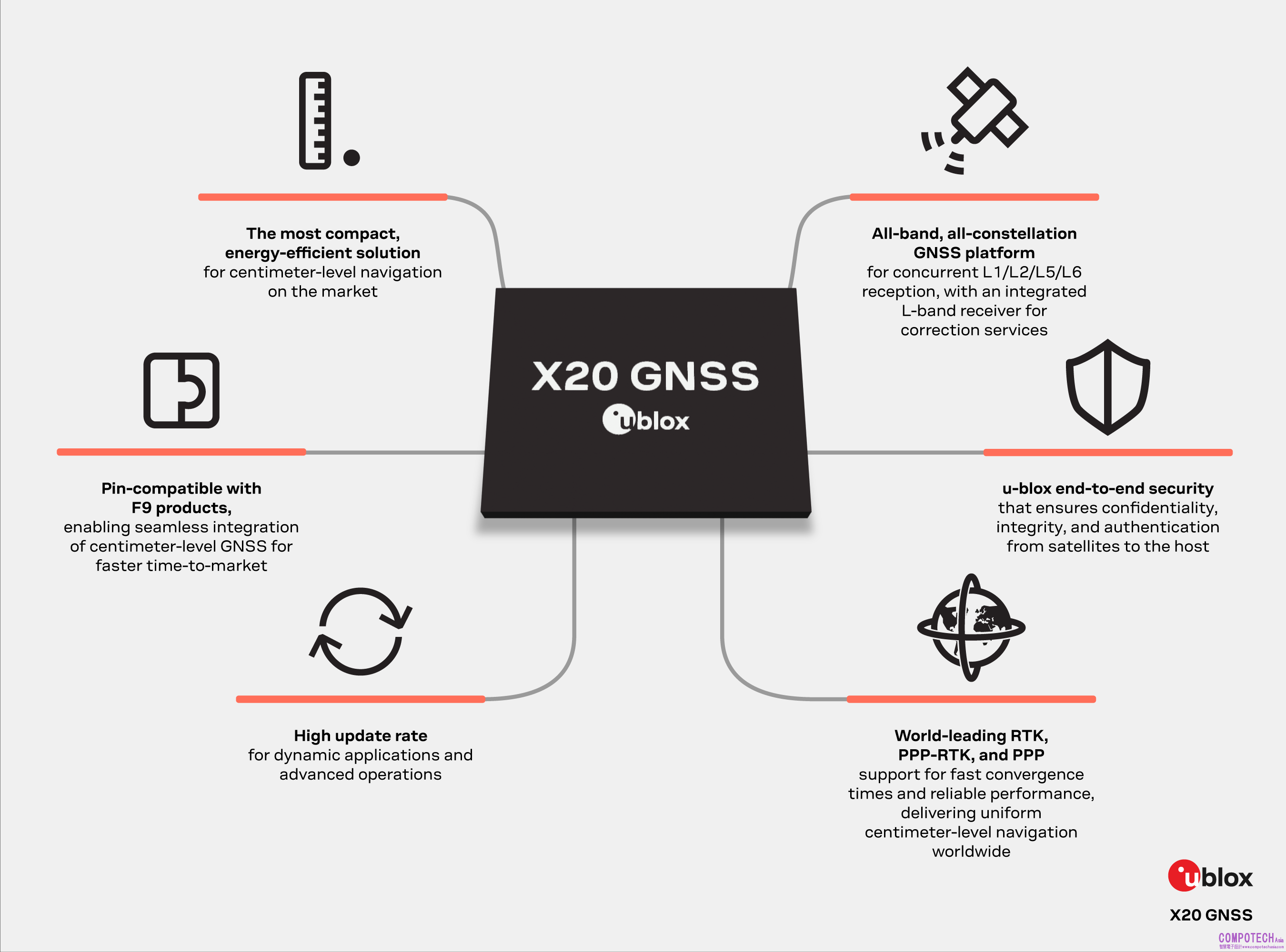 u-blox 執行長Stephan Zizala 表示:「X20 結合 u-blox GNSS 晶片、軟體、模組和校正服務的獨特能力,提供了一個在準確度、效能和安全性上超越任何替代解決方案的新產品。我們的 X20 平台將使公分級 GNSS 技術在全球大眾市場獲得廣泛應用。再結合 PointPerfect 的未來 PPP 版本,我們的客戶將能在全球各地享有一致的校正數據效能。」