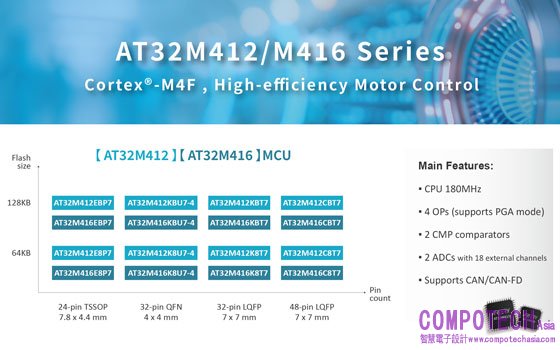 AT32M412/M416提供TSSOP24、QFN32、LQFP32、LQFP48等4種封裝共8個型號選擇。符合工業級溫度範圍(-40°C至105°C),工作電壓範圍2.4V至3.6V。從簡單的直流電機、步進電機,到複雜的無刷直流電機(BLDC)和永磁同步電機(PMSM),皆能實現精確、高效的控制,特別適合電動二輪車、電動機車、助力車、洗衣機、壓縮機、變頻器、工業風扇、伺服馬達及電動工具等應用。