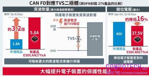 新產品透過優化元件結構,將引腳間電容*3降至最大3.5pF,可防止高速通訊時的訊號劣化。另外更實現出色的抗突波特性,大幅提高了車載環境中電子設備的保護性能。例如DFN1010封裝、可支援27V的新產品,與支援CAN FD的同等級市場競品相比,抗突波能力*4提高了約3.2倍,鉗位電壓*5也降低了約16%。可以有效保護車載ECU等昂貴且對突波敏感的電子設備,即使在嚴苛的車載環境中也能提供高可靠性。