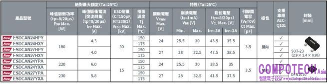 「ESDCANxx系列」共有SOT-23(2.9mm×2.4mm)和DFN1010(1.0mm×1.0mm)二種封裝,分别支援24V和27V的關斷電壓(VRWM)。SOT-23封裝有支援24V的「ESDCAN24HPY」、「ESDCAN24HXY」和支援27V的「ESDCAN27HPY」、「ESDCAN27HXY」共4款,DFN1010封裝有支援24V的「ESDCAN24YPA」、「ESDCAN24YXA」和支援27V的「ESDCAN27YPA」、「ESDCAN27YXA」共4款,二種封裝共合計8款新產品。