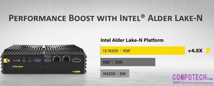 看準自動化應用對於電腦效能的持續要求,新一代的DC-1300系列可搭載最高的Alder Lake-N平台Intel® Core™ i3-N305處理器,運算效能較前代機種提升4.5倍。配備一個16GB DDR5 4800 MHz記憶體插槽與靈活多樣的儲存選擇,包含支援2.5吋SATA HDD/SSD或Half-Slim SSD,亦可透過M.2插槽擴充NVMe SSD,滿足不同應用場景的需求。