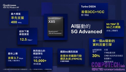 高通X85具備產業領先的5G Advanced特性,將為Android智慧型手機帶來連接方面的領先優勢。高通X85也為多種其他類型的裝置帶來5G Advanced功能,包括PC、固定無線接取、汽車、XR等。