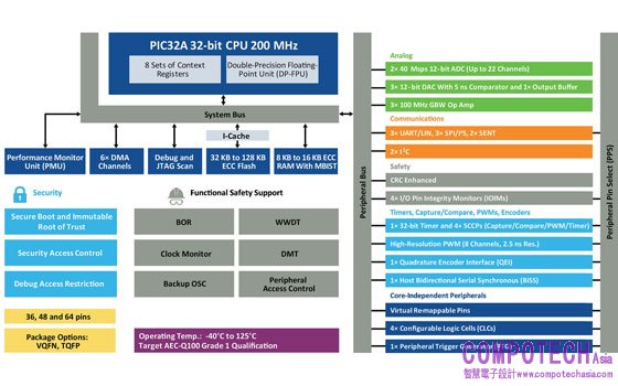此外,整合的硬體安全功能包括快閃記憶體和RAM的糾錯碼(ECC)、記憶體內置自測試(MBIST)、I/O完整性監控、時鐘監控、不可變安全啓動及快閃記憶體存取控制,旨在爲嵌入式控制系統應用中的軟體程式碼提供安全的執行環境。