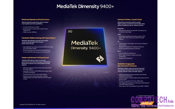 2025年4月10日-- 聯發科技今(10)日發表天璣9400+ 5G旗艦晶片。作為天璣旗艦系列最新晶片,天璣9400+在超高能效與效能提升的設計之下,提供卓越的生成式AI與Agentic AI能力,並支援最新大型語言模型(LLM)。