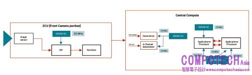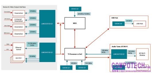 图 3. 新一代架構採用 CDC6C-Q1 振盪器,支援處理器與解串器