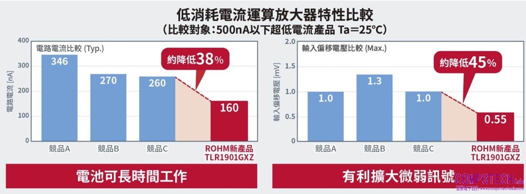 另外新產品的輸入偏移電壓*2在低消耗電流運算放大器中表現突出,最大僅為0.55mV,比競品減少約45%。輸入偏移電壓溫度漂移*3也能保證最大僅7µV/℃,即使在易受外部溫度影響的設備中也能實現高精度工作。