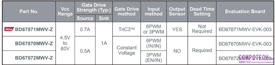 另外ROHM還推出了與新產品採用相同封裝和引腳配置的恒壓驅動通用馬達驅動器(BD67870MWV-Z、BD67872MWV-Z)。從通用型到本次採用TriC3™技術的高附加值型產品,ROHM可提供滿足客戶多樣化需求的豐富產品群。