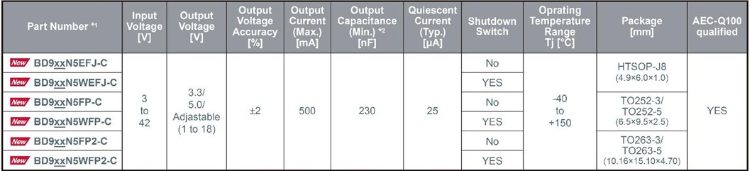 半導體製造商ROHM(總公司:日本京都市)針對車載設備、工業設備、通訊基礎設施等12V/24V系統一次側*1電源,開發出搭載ROHM超穩定控制技術「Nano Cap™」、輸出電流500mA的LDO穩壓器*2 IC「BD9xxN5系列」(共18款產品)。