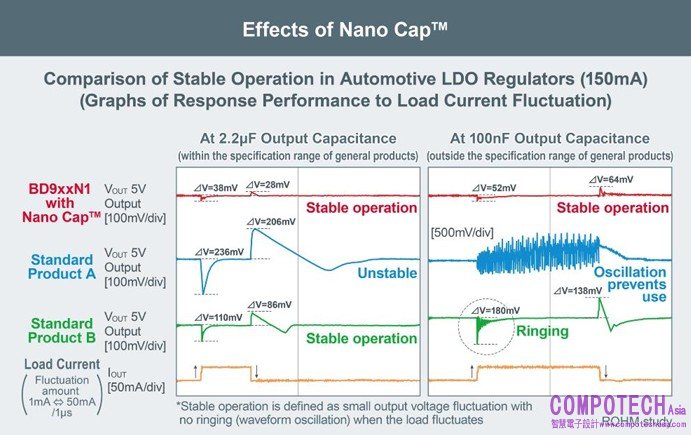 Nano Cap™是在ROHM垂直整合生產體制下,融合「電路設計」、 「電路佈線」、 「製程」三大先進類比技術優勢而實現的超穩定控制技術。該技術解決了類比電路中電容相關的穩定運行課題,有助縮短汽車、工業設備、消費性電子等各領域應用產品的設計週期。