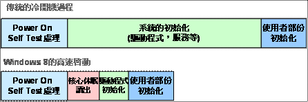 Windows 8由於Connected Standby的導入,宛如手機回復時間相當快速,僅約0.3秒。電池消耗時間16小時以上。然而冷開機,還是有驅動程式初始化的工夫。不過,Windows 8的啟動時間約6秒,其中最大的貢獻該說來自於核心部份適用於休眠。總之,可以說是組合了冷開機與休眠的混和型起動方法。況且,Windows 8也廢棄了傳統使用的BIOS,導入了新式的UEFI(Unified Extensible Firmware Interface),也有助於起動時間的短縮。