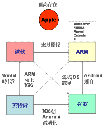 對英特爾來說,雖然找來谷歌開發Android專用的Atom處理器,市場會賜與機會嗎?而ARM野心勃勃,雲端風行需要低電力的資料中心(data center)還有伺服器用途,盡在ARM的攻擊企劃中。