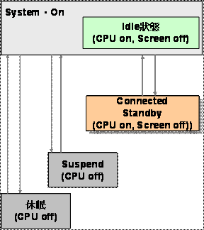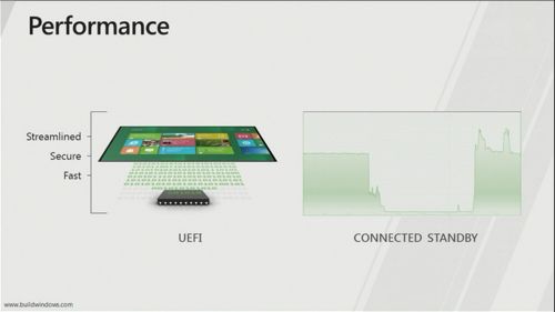 Windows 8最為傲人之處,是與手機並駕齊驅的電力管理,從待機(standby)回返僅須0.3秒,開機時間也僅有6秒。其中的焦點該是新導入的電力管理狀態「Connected Standby」;CPU在動作而銀幕顯示關閉的狀態。可以這麼來說,當使用者從應用或上層服務來停止之際,CPU會採用間歇性的動作方式,保持資料的最新狀態。關於這個概念的最為理想的思維方式,或許是視為雖然是在待機可是依然常時接續。