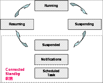 Windows 8的應用的執行模型,與Connected Standby協力來設計。為此,Metro Style應用定義了『Suspended』的狀態。當PC進入中止模式時,Metro Style應用全步轉移到『Suspended』狀態。