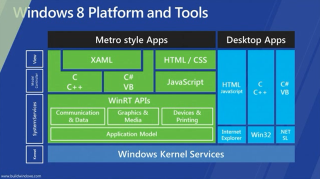Windows 8採用傳統的桌面以及Metro Style UI兩者共存的構成方式。換句話說,傳統桌面應用程式的動作會透過Win32,Metro Style應用執行時改成WinRT;無論是IE還是控制面板,會有相對應的版本。而,Metro Style應用程式開發的基礎即是HTML5與JaavaScript。無論是IE的呈現以及執行引擎上動作,無論是ARM版還是x32/x64的版本,同一應用可以在全部的平台上動作。執行模型有點類似Ajax的Web應用。若是覺得難以體會,無妨這麼來說吧。Windows 8的Metro Style環境或許該是接近於谷歌的「Chrome OS」或是HP的「webOS」。