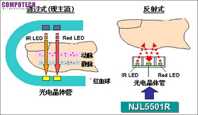 前述日本大學與豐田技術的採用,就是利用LED來測定心率、脈搏。在指間接觸部分,配置了發光LED以及光電晶體的受光部分,活用了血液中含血紅蛋白(Hemoglobin)容易吸收綠色特定波長的特性,利用LED光照射手指從反射光來檢測出脈搏的手法。而這個手法的解決方案已經在2013/6由新日本無線,將綠色LED以及光電晶體整合成一個封裝,做為脈搏感應器來出貨。當然,完全的方案尚且有其內部的Know-How技術存在。