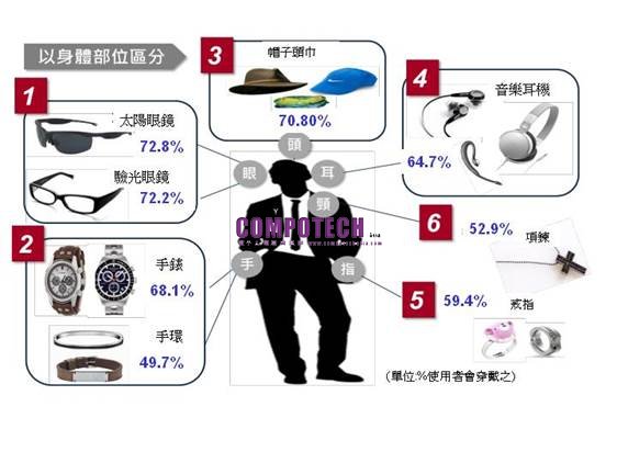 對於使用者來說,穿戴物品相較於智慧手機更貼近身心,畢竟智慧手機不是穿戴在身體部位,可以任意放置在其他地方,但穿戴裝置必須穿戴在身上,更左右使用者的日常行為。根據使用者穿戴行為研究調查顯示,使用者所偏好的穿戴部位與穿戴物品,依序為:(1)眼部:不論是太陽眼鏡或視力矯正用的驗光眼鏡,所占比例最高,約72%;(2)頭部:一般使用者戴帽子或頭巾的比例占70%;(3)手部:使用者習慣在手腕上戴手錶(68.1%)或手環(49.7%),以及戒指(59.4%)。而音樂耳機早為消費大眾所熟悉的穿戴裝置約占64.7%。如圖1所示。