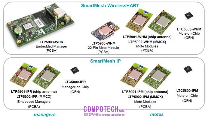 SmartMesh 可透過管理器 (manager) 做到「時間同步」,精準設置節點裝置動作時間點,決定何時喚醒、傳輸?管理器可指定節點裝置要循序逐次動作,還是同時整齊劃一地演出?每個節點的時間誤差均低於 1μs。由於節點真正在工作的時間不到百分之一,功耗僅有數十 μA,低放電的鈕釦電池理論上可用 5~10 年。SmartMesh 有兩個版本:WirelessHART 是針對工廠常用的 HART 協定就地升級,電氣、煉油廠、輸油管等嚴峻的工業自動化環境監測;IP 版本則是遵照網際網路 IP 協定,戶外距離可達 300 公尺,適用於對干擾、屏蔽敏感的場域。