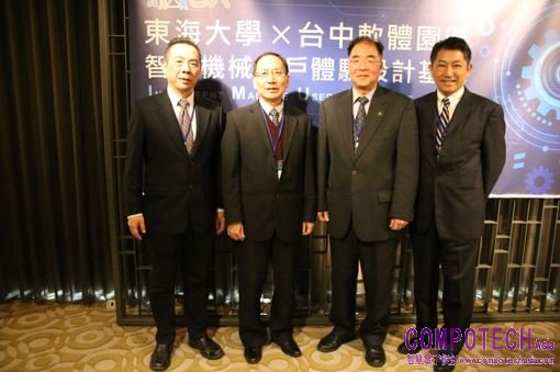 照片人物:(左起) IMUX 負責人周忠信、東海大學校長王茂駿、副校長王立志、工業工程與經營資訊學系教授李永輝