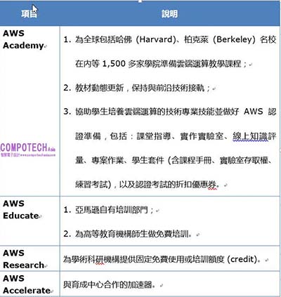 表:亞馬遜 AWS 的推廣教育類別