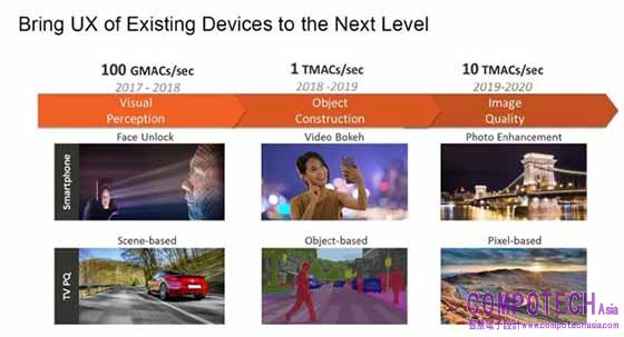 吳驊指出,2017 年未有專用加速器出現時,深度學習 (Deep Learning) 的運算仍仰賴GPU或CPU之力,無法針對加、乘運算加速,運算力約在 100 GMACs/sec 之譜,頂多只能做影像分類、物件偵測、臉部解鎖或不同場景參數等視覺感知;2018 年,開始有不少晶片廠商將 AI 處理能力加到系統單晶片 (SoC) 中,運算提升至 1TMACs/sec,可做影像分割 (Partition)、深度估算、攝影散景 (Bokeh) 或以個體為基礎等局部物件建構;今後為追求影像品質,將往 10 TMACs/sec 挺進、做夜拍照片強化或像素等級處理,著重超級解析度與降低雜訊。