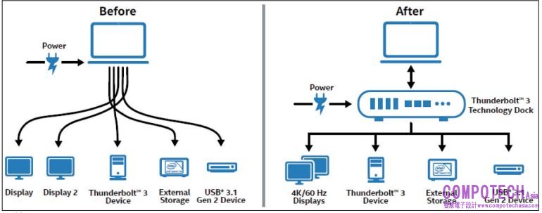 2011 年 2 月 24 日英特爾推出了 Thunderbolt 技術,旨在將資料、視頻傳輸和供電都整合在一個小型連接器上。Thunderbolt 支援使用者通過這一個介面,在連接的智慧設備 ( 如 PC、擴展塢、顯示器、固態盤、外部硬碟和攝像頭 ) 之間快速、自如地傳輸資料。當時,Thunderbolt 宣稱能夠在不到 30 秒的時間內傳輸一部完整長度的高清電影,並在10 多分鐘內備份可以連續播放一整年的 MP3 音樂。
