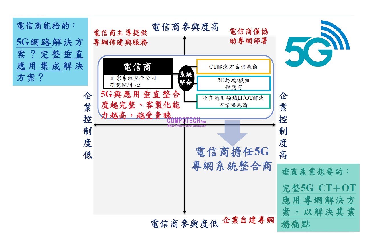 4. 電信商往專網系統整合 (SI) 發展:電信商與第三方夥伴深度合作,提供整合開發垂直應用專網解決方案,成為廠商建置 5G 專網並提供服務的主要協力者 (甚至進化成系統整合商)。